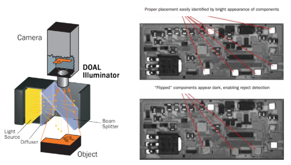 適當顏色的光源照射在電路板上,能使特定的電路板部件反射明亮的光,而錯誤安裝的部件會吸收光而呈現(xiàn)出暗色。機器視覺系統(tǒng)能夠迅速識別這些錯誤。在這種應(yīng)用中,采用同軸照明技術(shù)及藍色光源。藍色波長(460納米)能明顯區(qū)分銀和銅表面:銅吸收藍光,出現(xiàn)暗色,銀反射藍光,出現(xiàn)亮色。